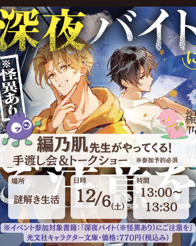 こちらの TEKET サイト(https://teket.jp/15020/59525)にて事前にご予約いただき、当日レジカウンターにて 対象書籍『深夜バイト(※怪異あり)にご注意を』をご購入いただいたお客様には、サイン会整理券を配布させ ていただきます。