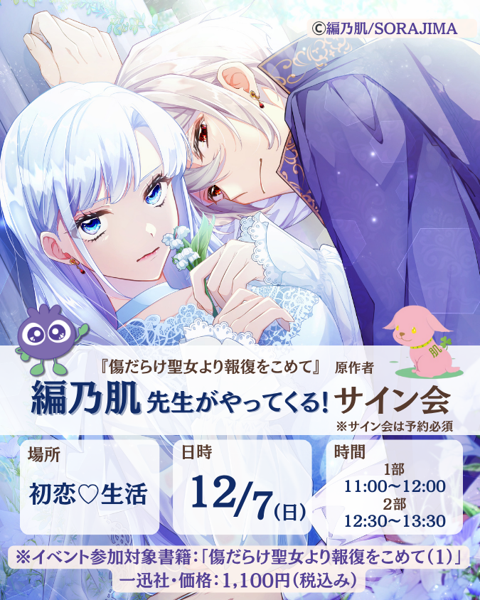 こちらのTEKETサイト(https://teket.jp/15020/58264)にて事前にご予約いただき、当日レジカウンターにて対象書籍『傷だらけ聖女より報復を(1)』をご購入いただいたお客様には、サイン会整理券を配布させていただきます。