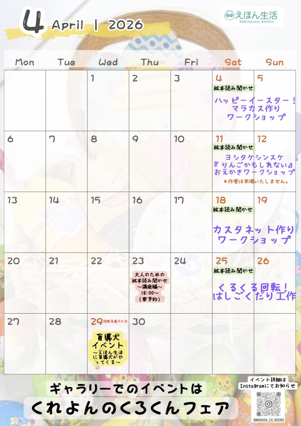 名古屋伏見の絵本専門店『えほん生活』の4月のイベントカレンダーを更新しました!